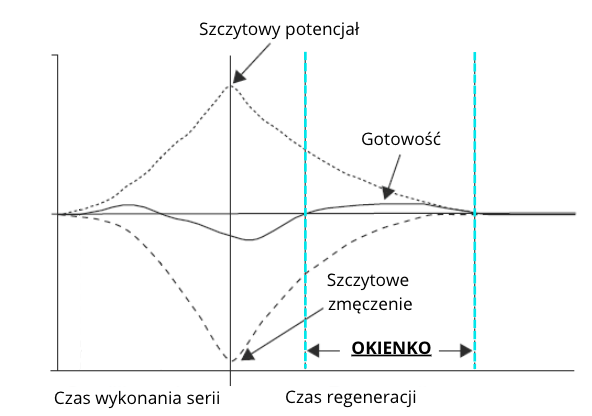 Posiadając te podstawowe informacje, pora na ustalenie optymalnego czasu przerwy pomiędzy ćwiczeniem kondycyjnym, a aktywnością wyczynową, co będzie kluczową lecz mocno różniącą się osobniczo kwestią. Tłumacząc: jeśli nie zapewnimy wystarczającej ilości czasu na odpoczynek, może nie nastąpić poprawa wydajności na skutek zbyt dużego zmęczenia, które nadal utrzymuje się po ćwiczeniu kondycyjnym. Natomiast jeśli zapewnimy zbyt dużo odpoczynku, wzmocnienie (potencjacja) może się „rozproszyć”, nie powodując również poprawy wydajności. Koncepcję tę przedstawia poniższy rysunek.